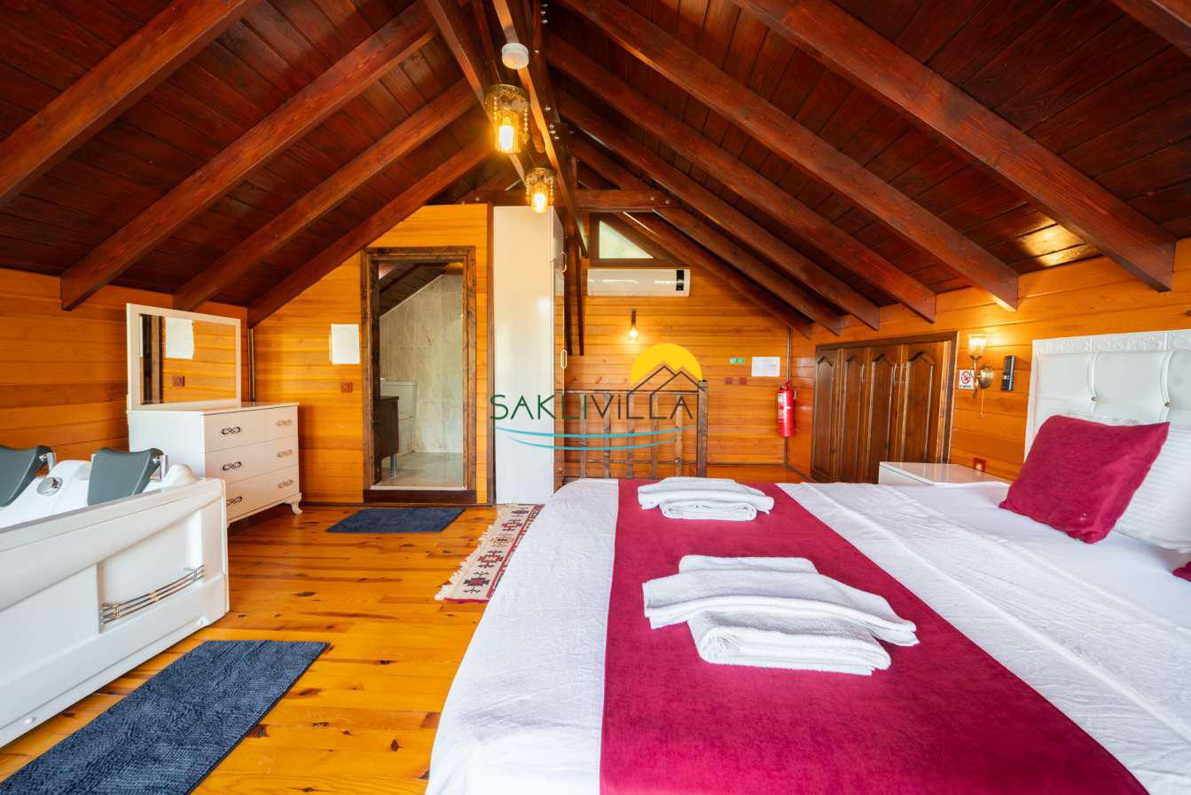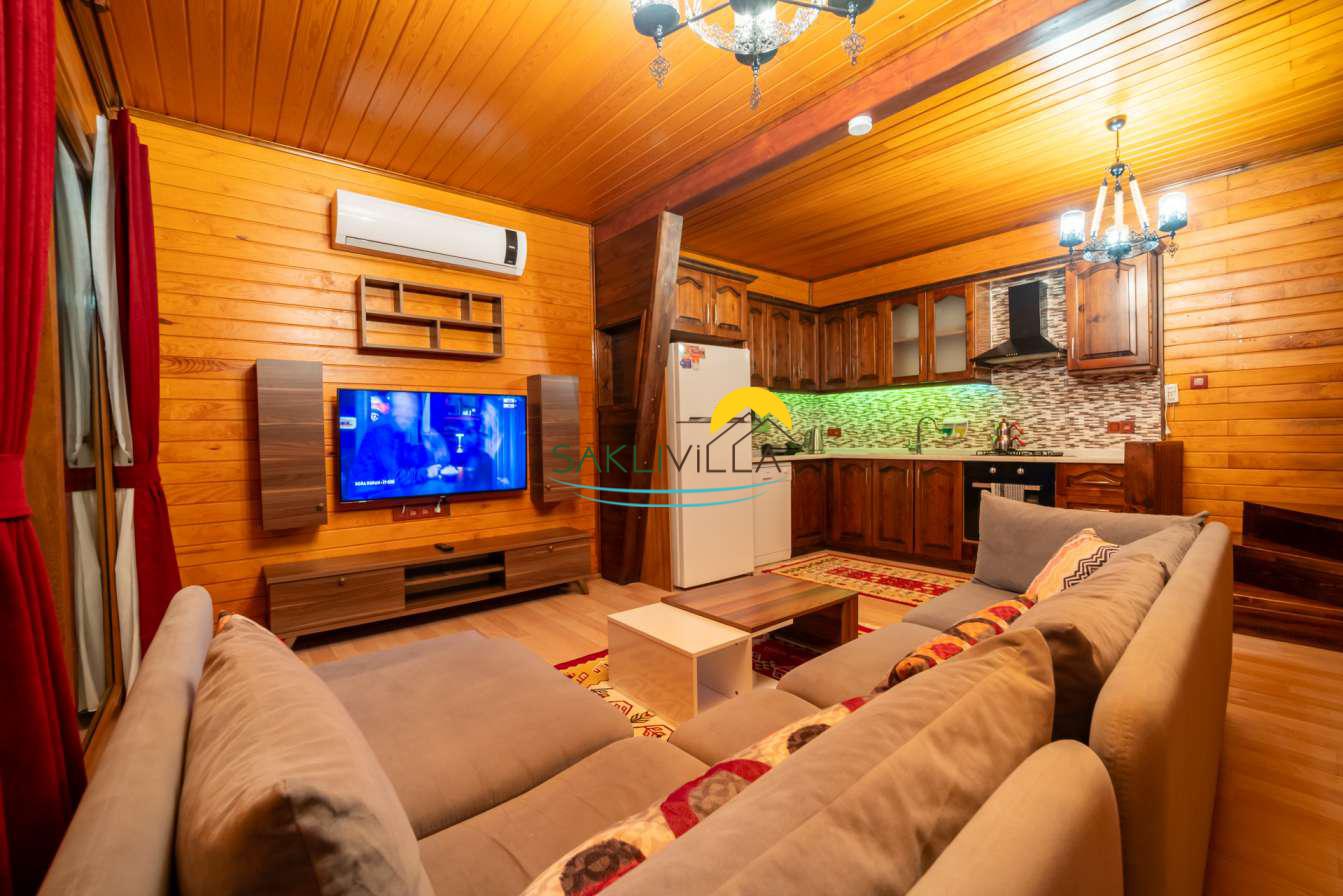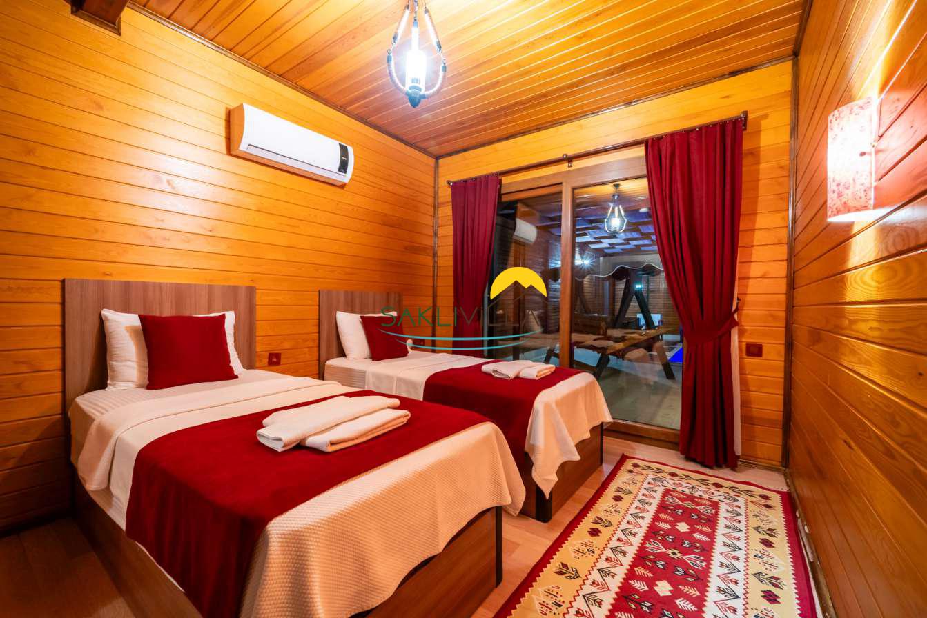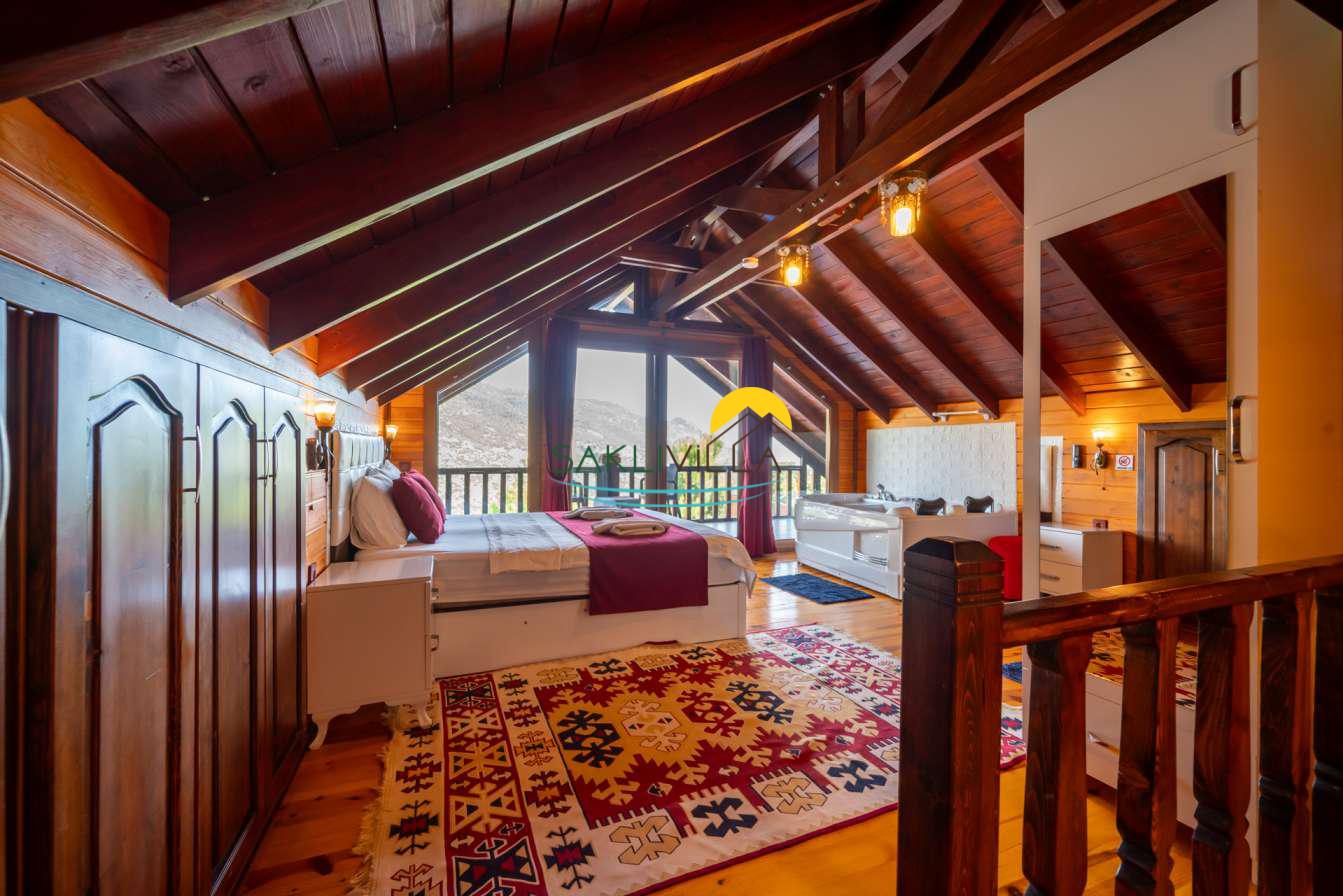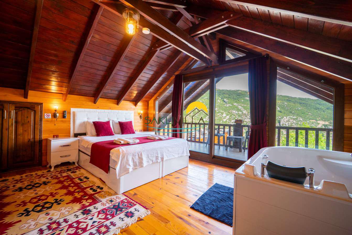 Ahşap mimarisi, doğanın estetiği ile bütünleşen bir tasarım anlayışını yansıtır. kiralık villa’nın iç mekanları da, modern konforu geleneksel bir atmosferle birleştirecek şekilde dekore edilmiştir. 2 yatak odası ve 4 kişi konaklama kapasitesi ile geniş bir aile ya da balayı çiftleri için ideal bir alan sunar. Her detayı düşünülmüş olan Villa Seyir, ferahlığı ve lüksü bir arada hissettirirken, misafirlere evlerinde gibi hissettirecek sıcak bir ortam sağlamaktadır.