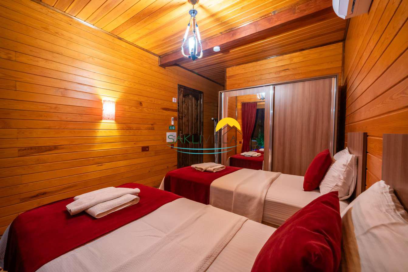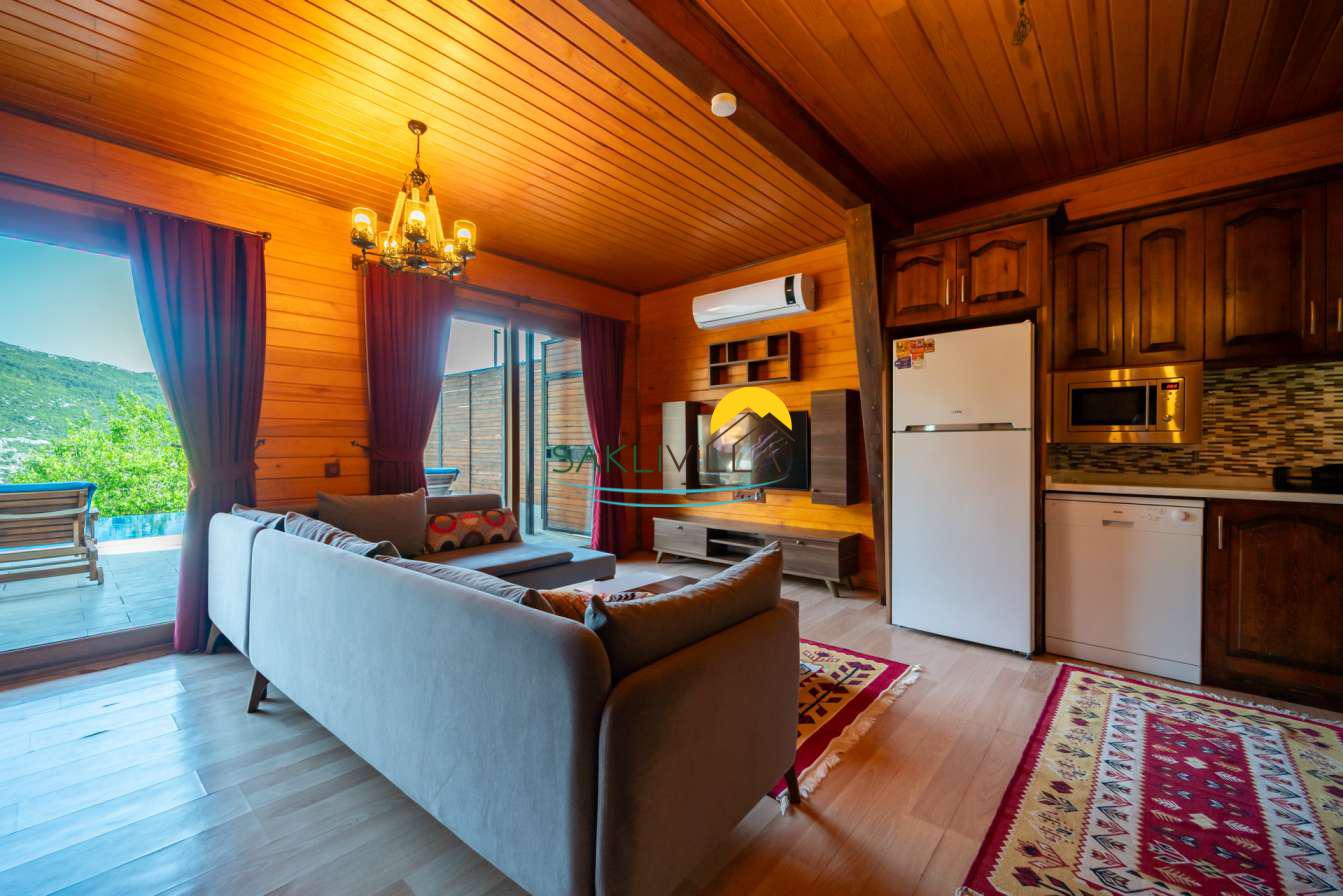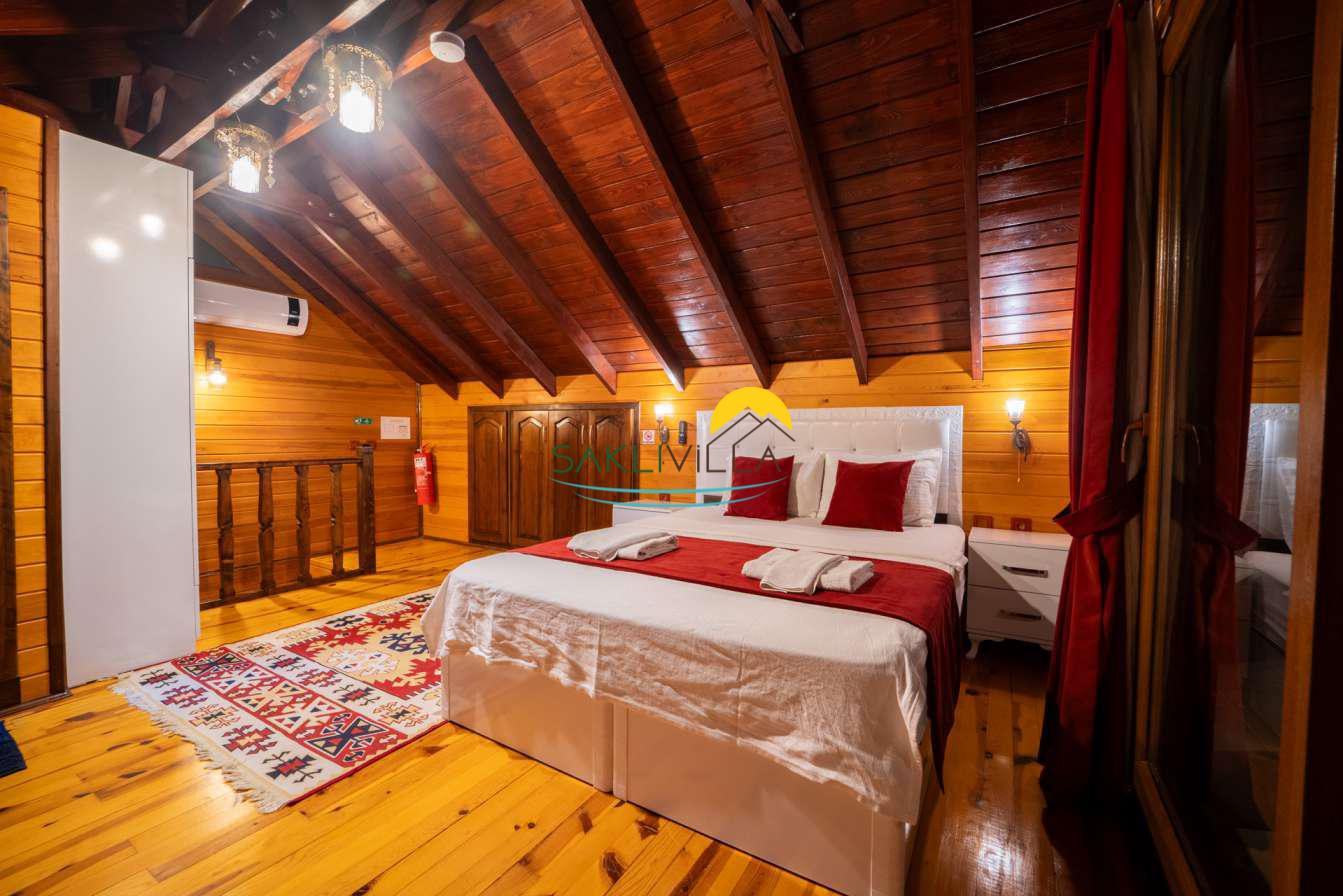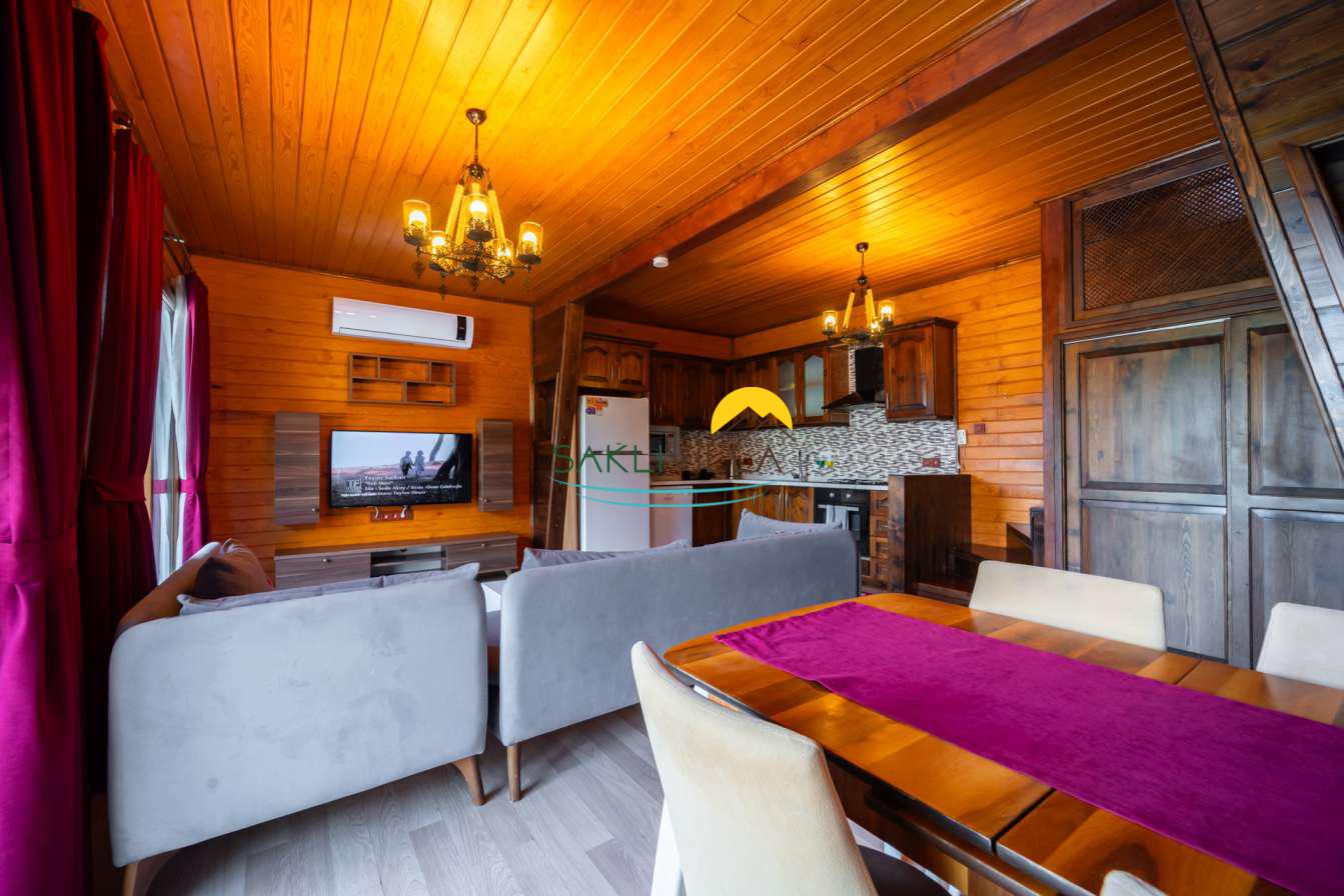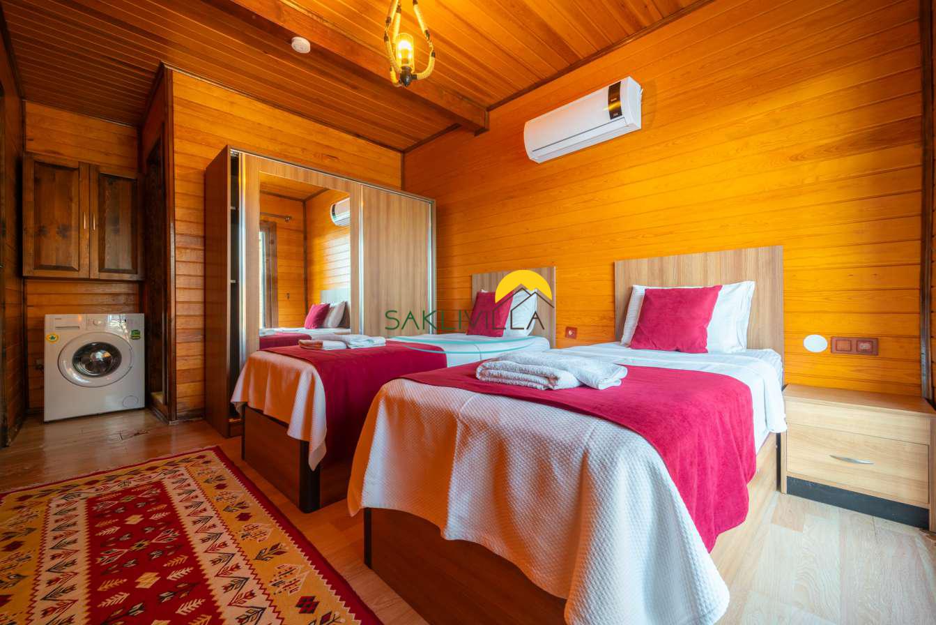 Ahşap mimarisi, doğanın estetiği ile bütünleşen bir tasarım anlayışını yansıtır. kiralık villa’nın iç mekanları da, modern konforu geleneksel bir atmosferle birleştirecek şekilde dekore edilmiştir. 2 yatak odası ve 4 kişi konaklama kapasitesi ile geniş bir aile ya da balayı çiftleri için ideal bir alan sunar. Her detayı düşünülmüş olan Villa Seyir, ferahlığı ve lüksü bir arada hissettirirken, misafirlere evlerinde gibi hissettirecek sıcak bir ortam sağlamaktadır.