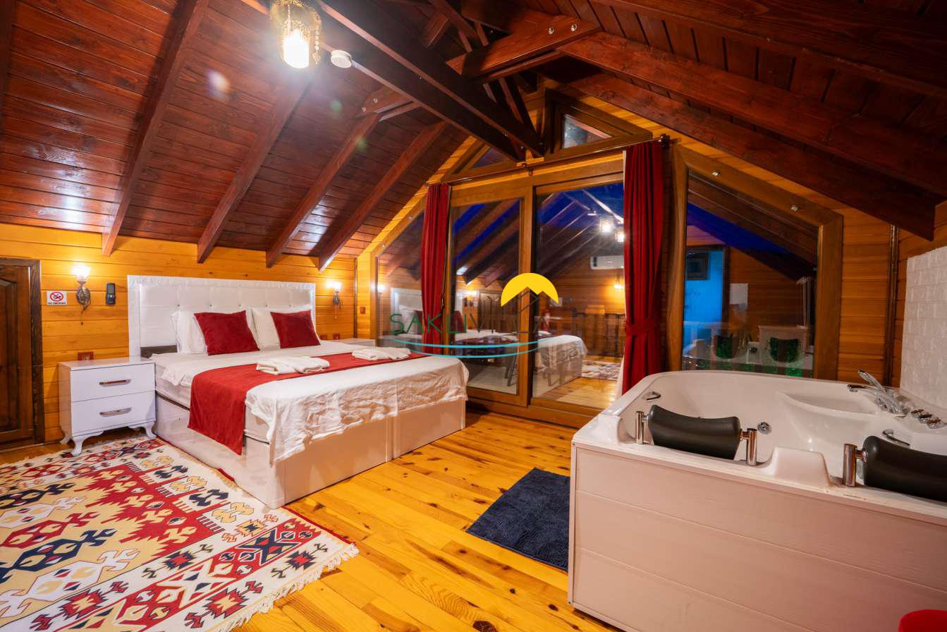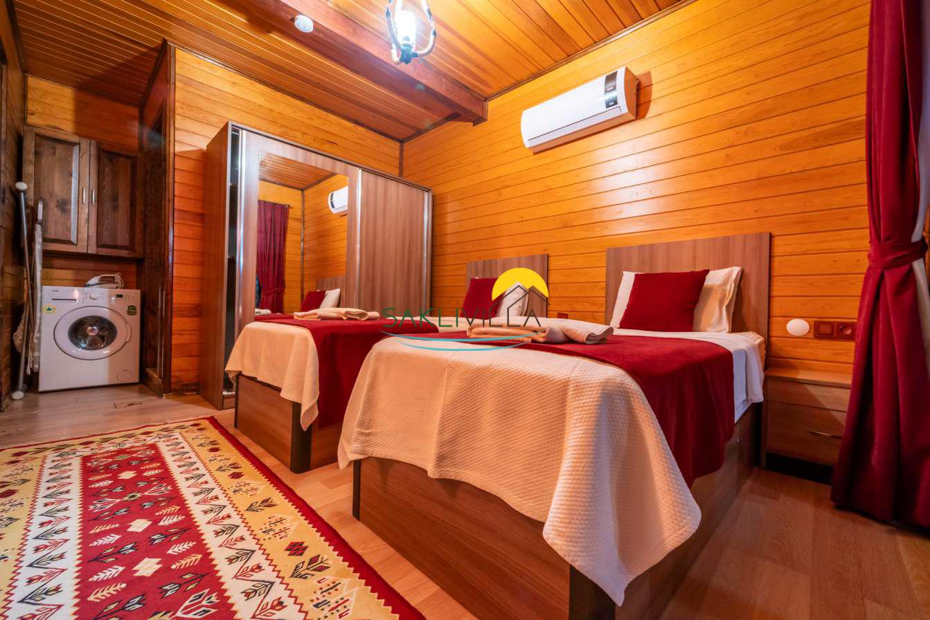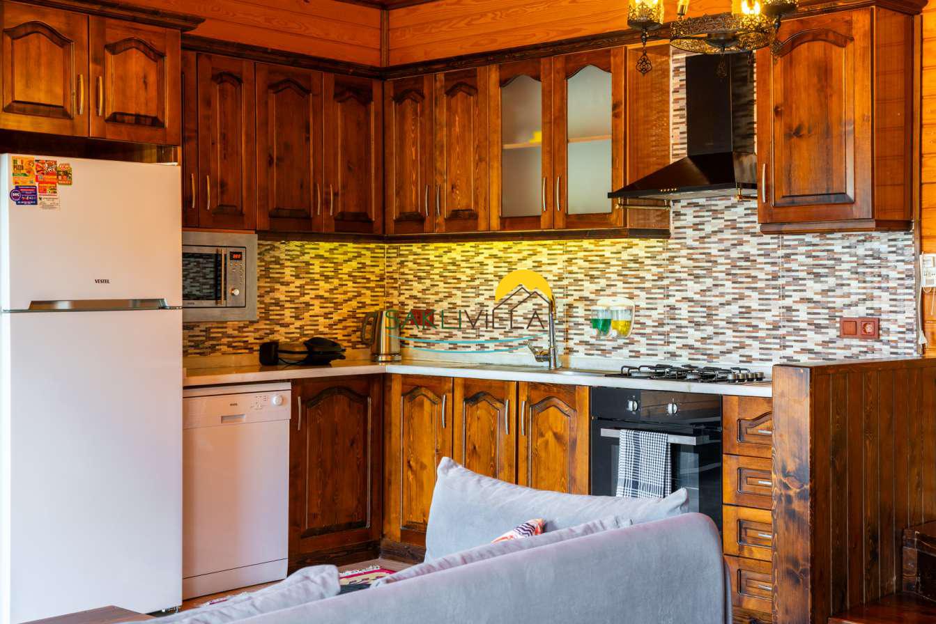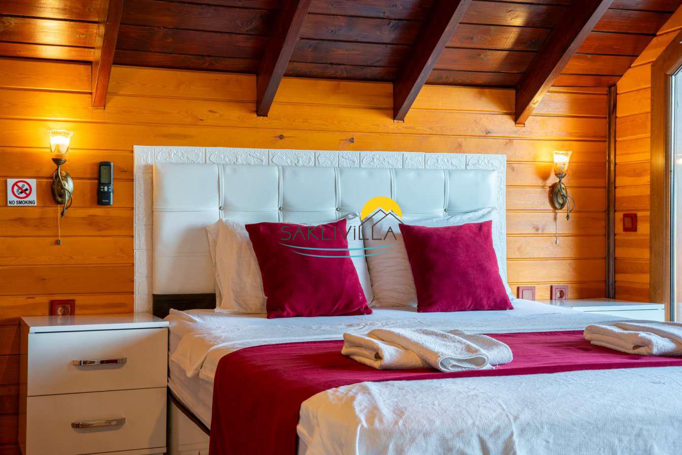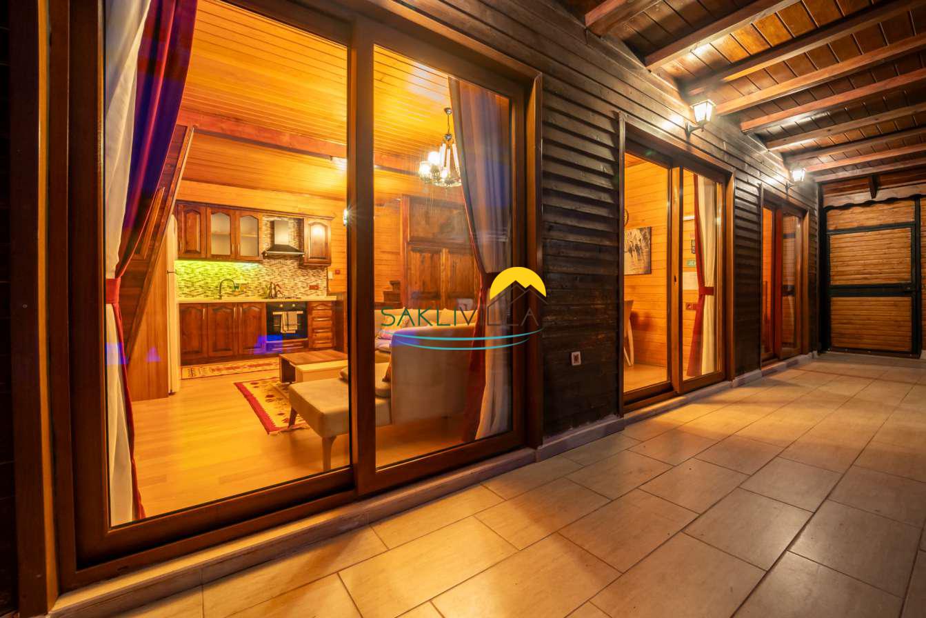 Ahşap mimarisi, doğanın estetiği ile bütünleşen bir tasarım anlayışını yansıtır. kiralık villa’nın iç mekanları da, modern konforu geleneksel bir atmosferle birleştirecek şekilde dekore edilmiştir. 2 yatak odası ve 4 kişi konaklama kapasitesi ile geniş bir aile ya da balayı çiftleri için ideal bir alan sunar. Her detayı düşünülmüş olan Villa Seyir, ferahlığı ve lüksü bir arada hissettirirken, misafirlere evlerinde gibi hissettirecek sıcak bir ortam sağlamaktadır.