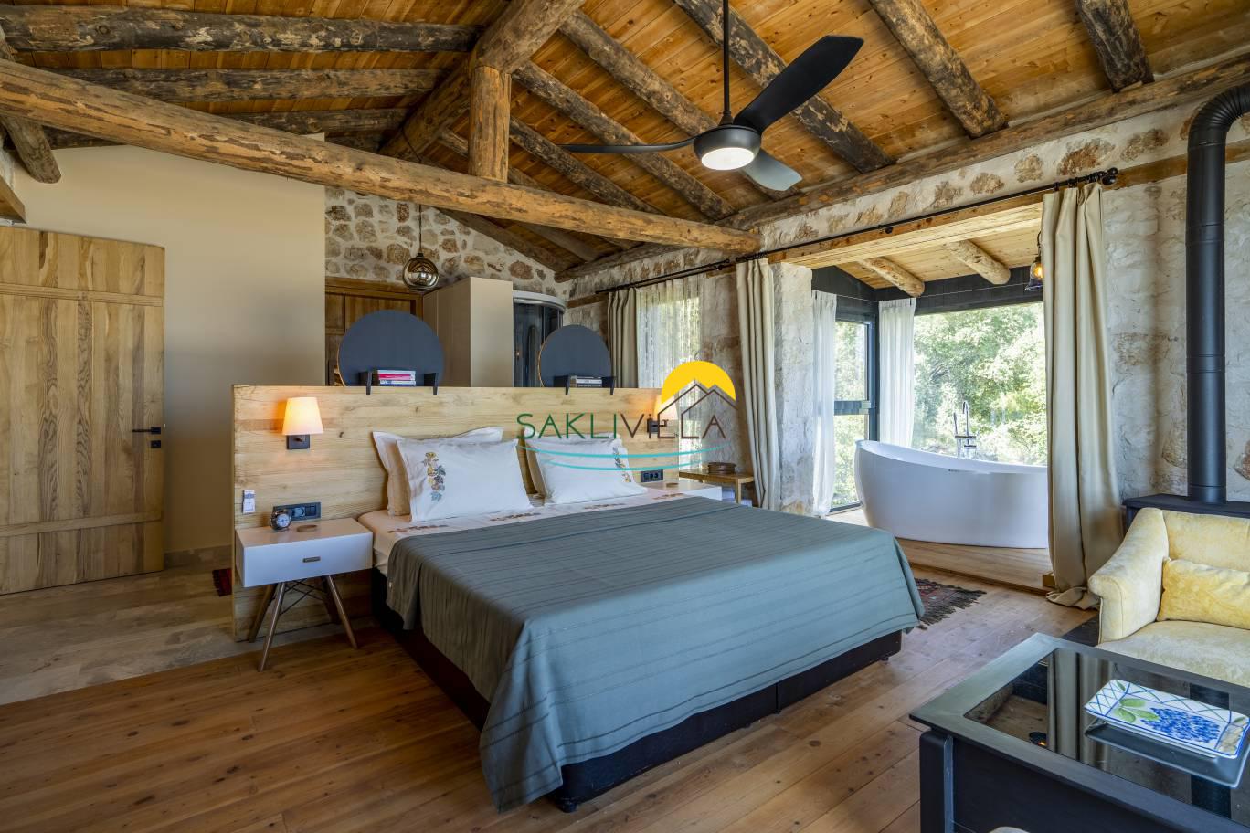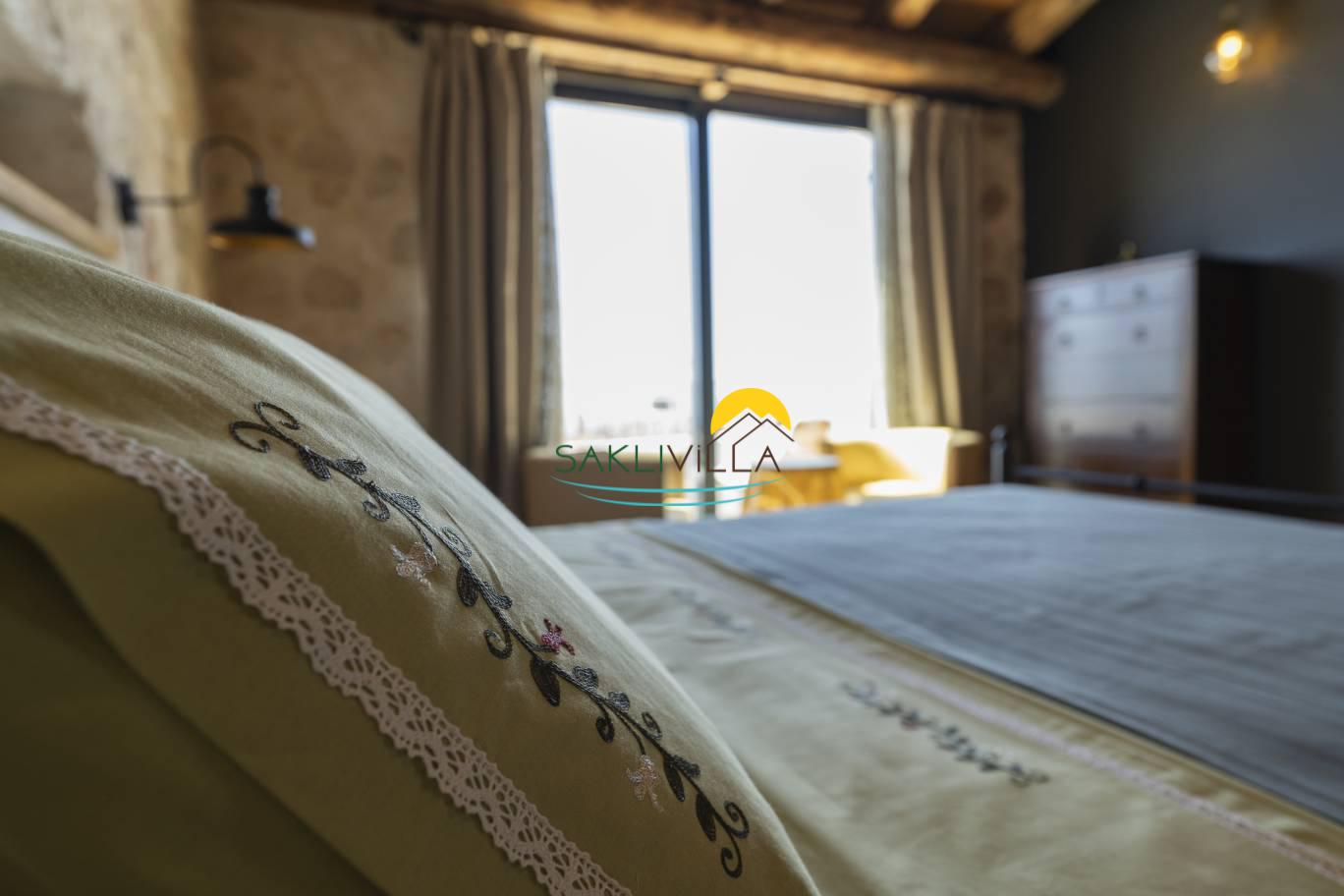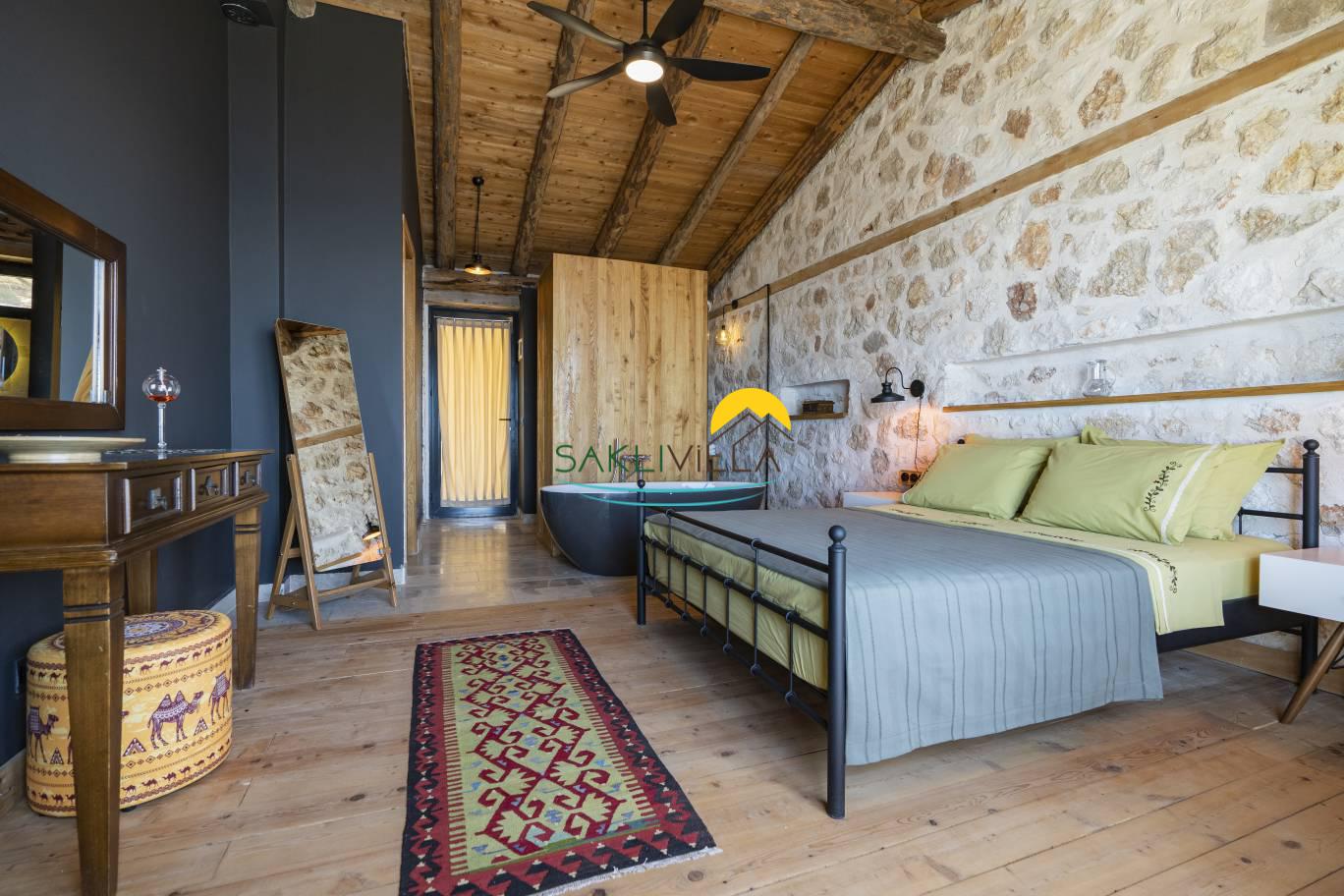 Tatil villasının iç mekan tasarımı da, lüks ve konfor anlayışını yansıtmaktadır. Özenle döşenmiş yatak odaları, rahat yataklar, klima, özel banyo ve tuvalet gibi olanaklarla donatılmıştır. Her bir yatak odası, misafirlerin rahatı ve konforu düşünülerek tasarlanmış olup, kişisel eşyaların saklanabileceği geniş dolaplar ve diğer depolama alanları da mevcuttur. Villanın genelinde kullanılan malzemeler, kaliteli ve dayanıklı olup, estetik bir görünüm sunmaktadır. Aydınlatma, hem doğal ışık hem de yapay aydınlatma unsurları ile dengelenmiş olup, her türlü ihtiyaca cevap verecek şekilde düzenlenmiştir.