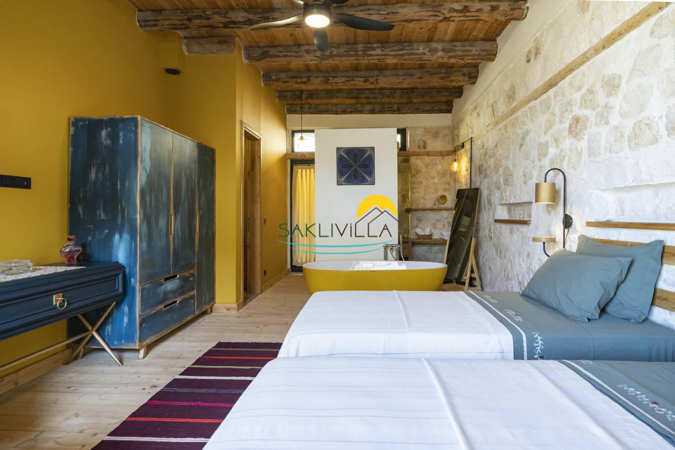 2.Yatak odası: Yatak odası içerisinde, 2 adet tek kişilik yatak, klima, elbise dolabı, komodin, makyaj masası, küvet, banyo ve tuvalet yer almaktadır.