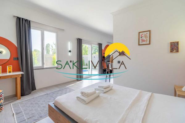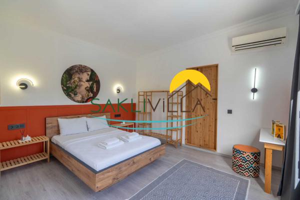 Villa Snitch’in iç yapısı, modern ve konforlu bir tatil deneyimi için gerekli tüm unsurları barındırmaktadır. Yatak odasında yer alan çift kişilik yatak, klima, komodin, makyaj masası ve elbise dolabı gibi olanaklar, misafirlerin konforunu ön planda tutan detaylardır. Banyo ve tuvalet alanlarının da evin içinde entegre bir şekilde sunulması, kullanım kolaylığı açısından büyük bir avantaj sağlamaktadır. Tüm bu unsurlar, misafirlerin tatilleri boyunca kendilerini evlerindeymiş gibi hissetmelerine yardımcı olmaktadır.