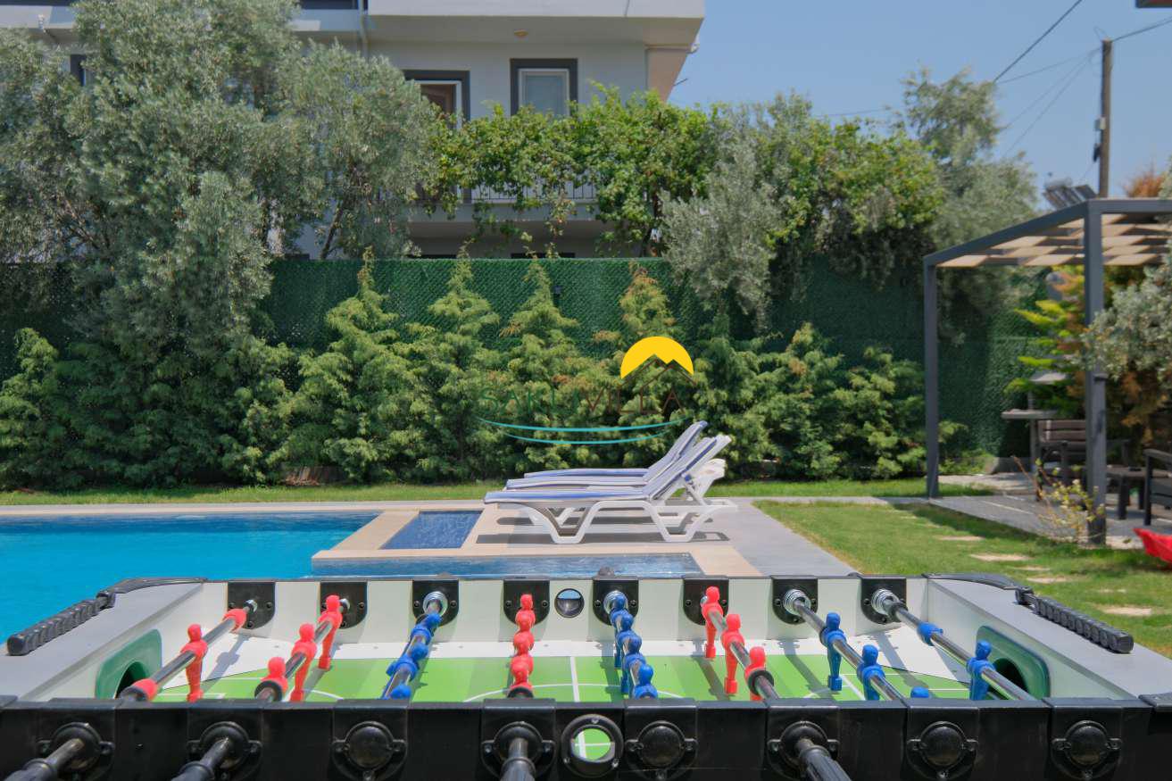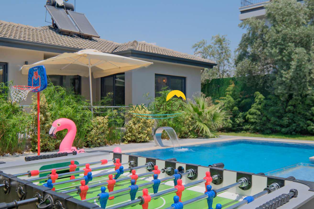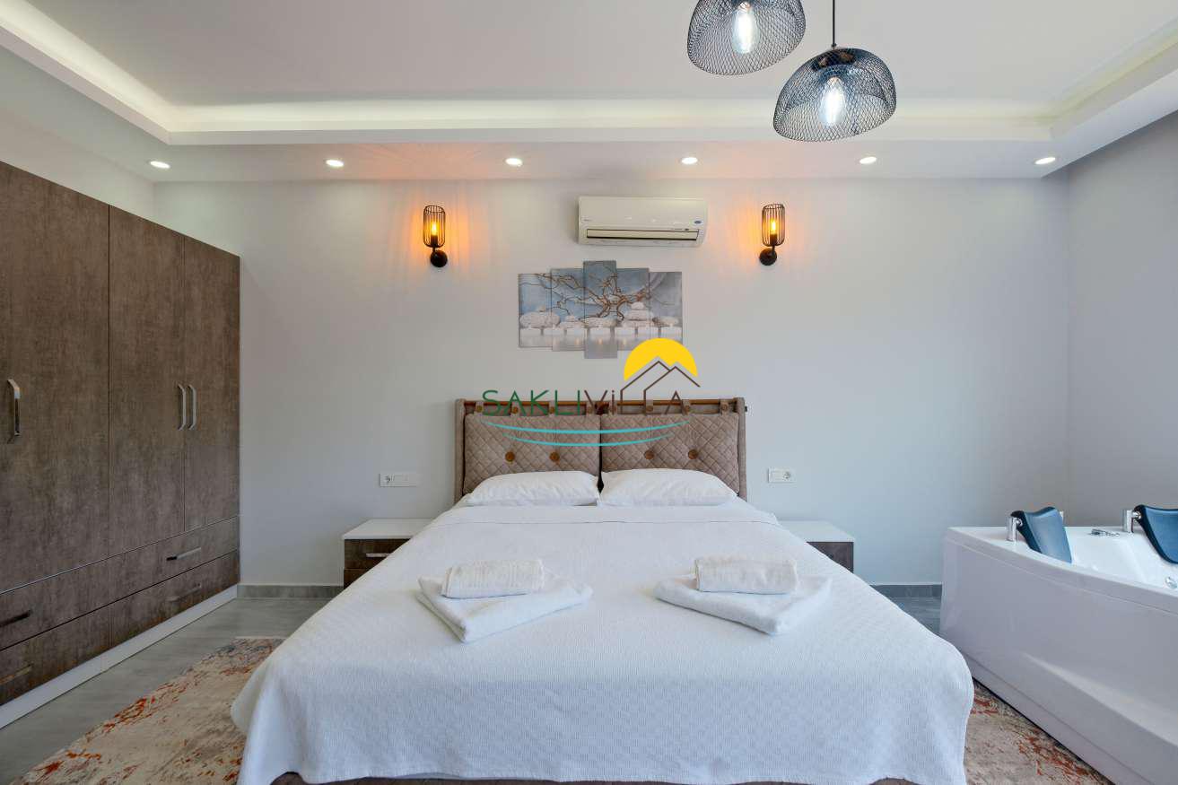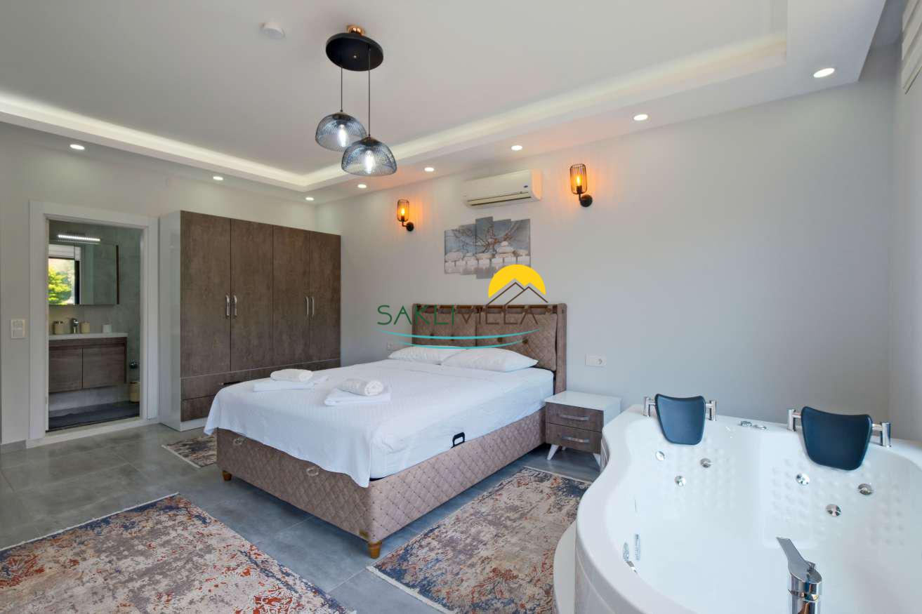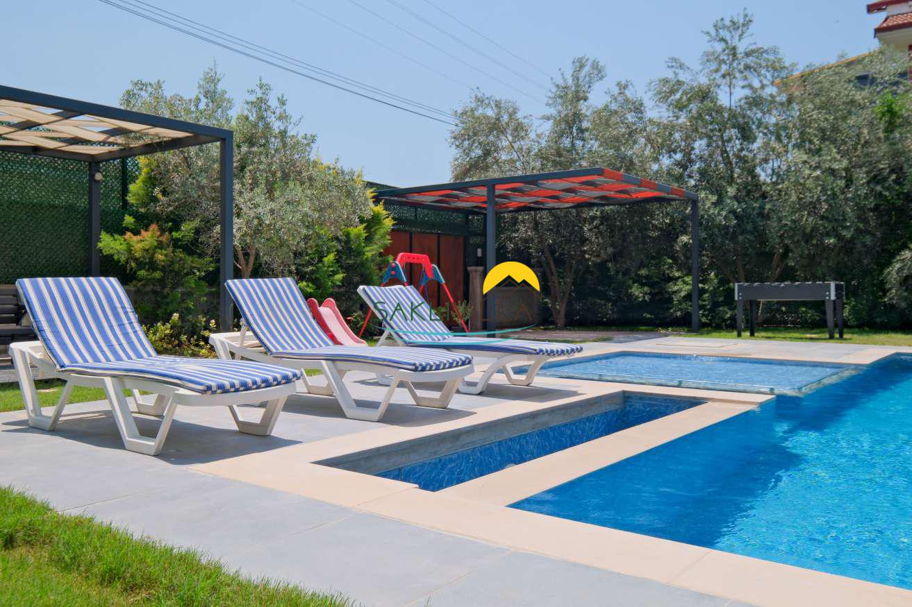 Villa Tan’ın en önemli özelliklerinden biri, özel yüzme havuzudur. Havuz, misafirlerin sıcak yaz günlerinde serinleyebileceği, havuz başında dinlenip keyifli vakit geçirebileceği bir alan sunar. Bu özel alan, villanın sunduğu konfor ile birleşince, tatilinizi çevreden bağımsız, tamamen rahatlatıcı ve özgür kılar. Ayrıca, villa içerisinde yer alan sauna ve jakuzigibi ekstra donanımlar, konuklara hem fiziksel hem de ruhsal olarak yenilenme fırsatı verir. Özellikle jakuzi, bir yatak odasında bulunmasıyla konforu artırarak, tatil boyunca dinlenme deneyimini üst seviyeye taşır.