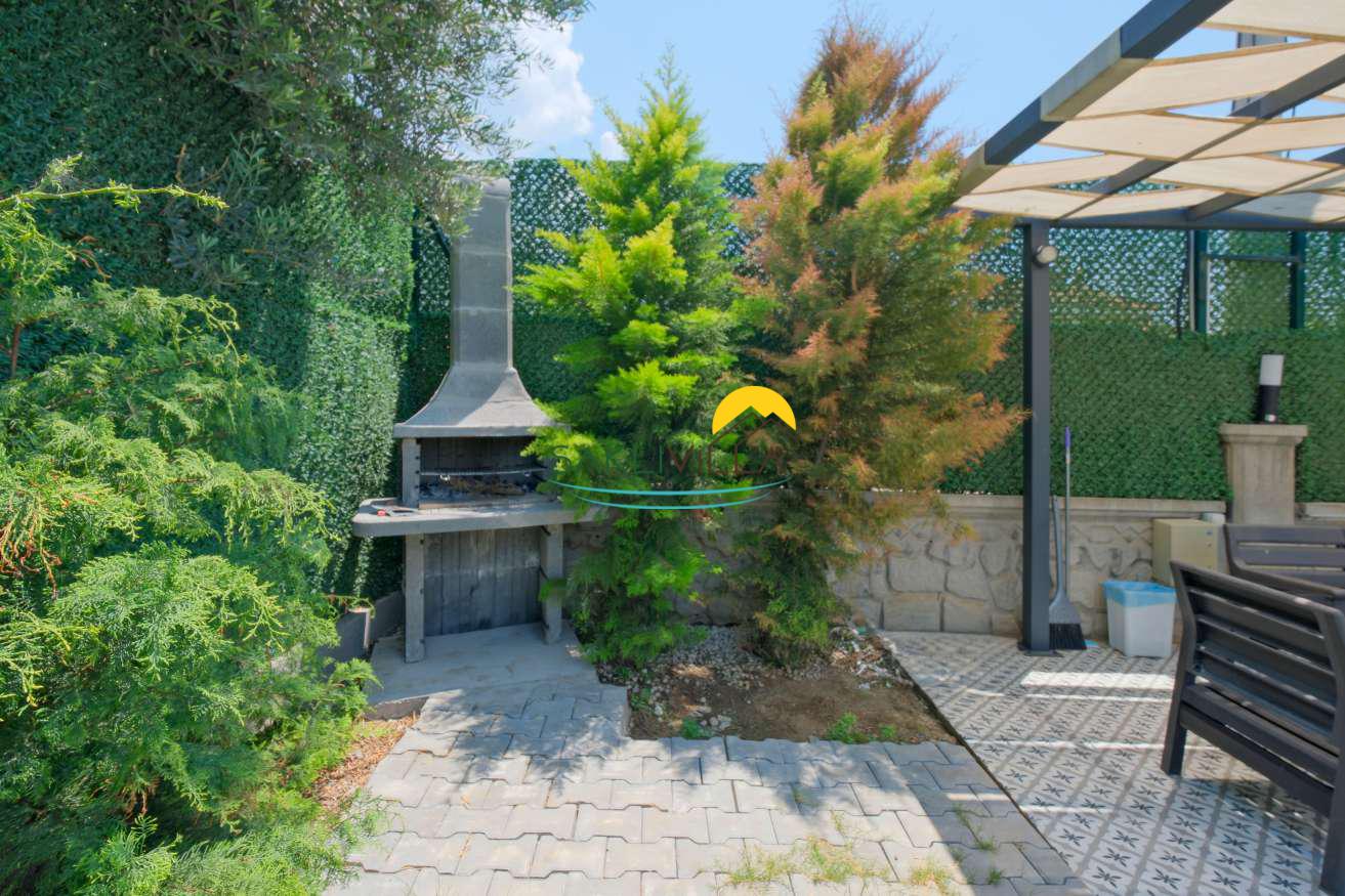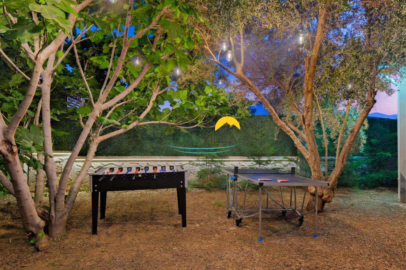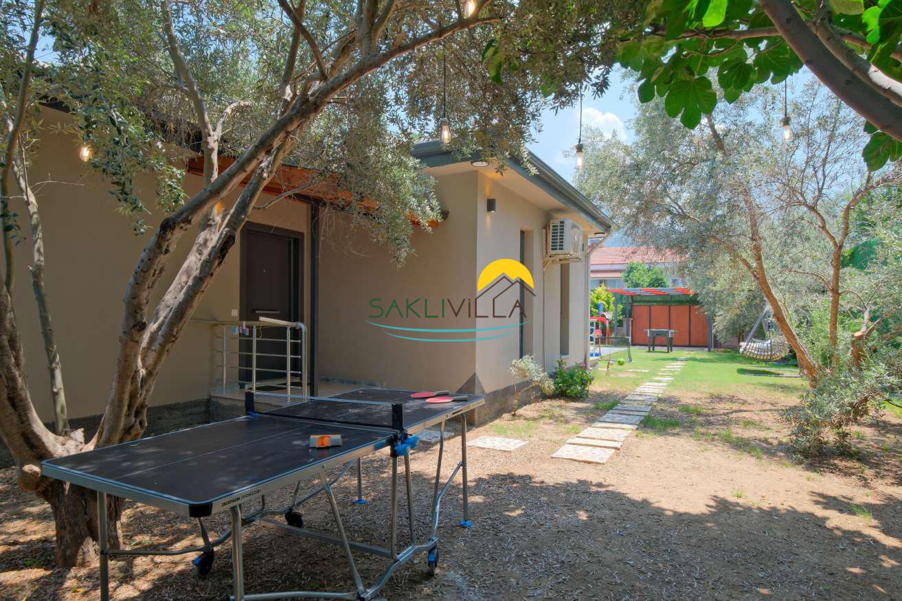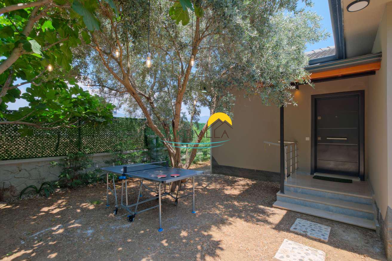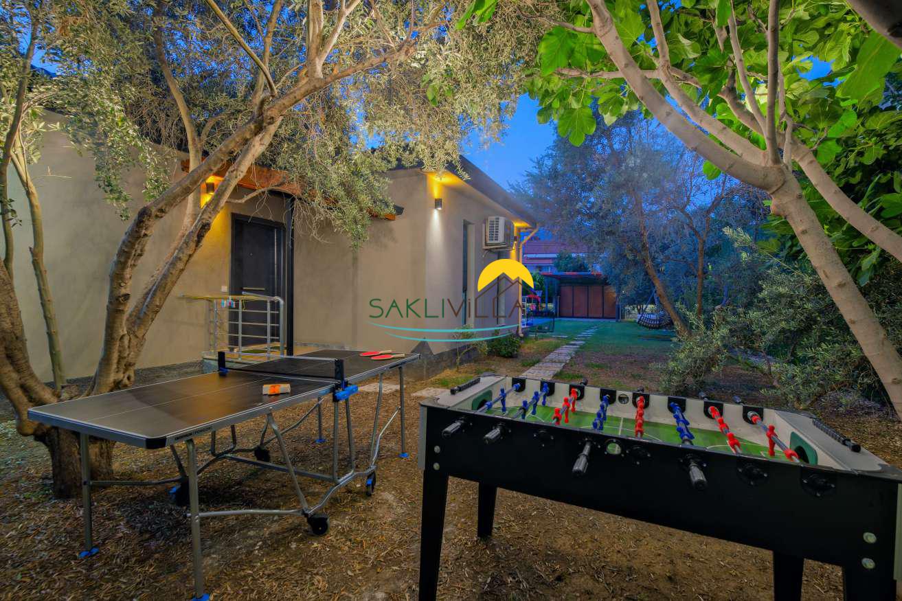 Geniş ve bakımlı bir bahçe içerisinde, zeytin ağaçlarının arasında yer alan villa, doğal ve ferah bir ortam sunar. Bu yeşil atmosfer, ziyaretçilere sadece görsel bir şölen değil, aynı zamanda yılın yoğun temposundan bir kaçış noktasıdır.