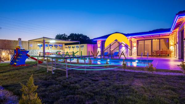 Tatilinizi eğlenceli hale getirmek için bahçesinde salıncak, bahçe oturma alanı, kaydırak gibi ekstra özelliklere ve yeşil bir bahçeye sahiptir.