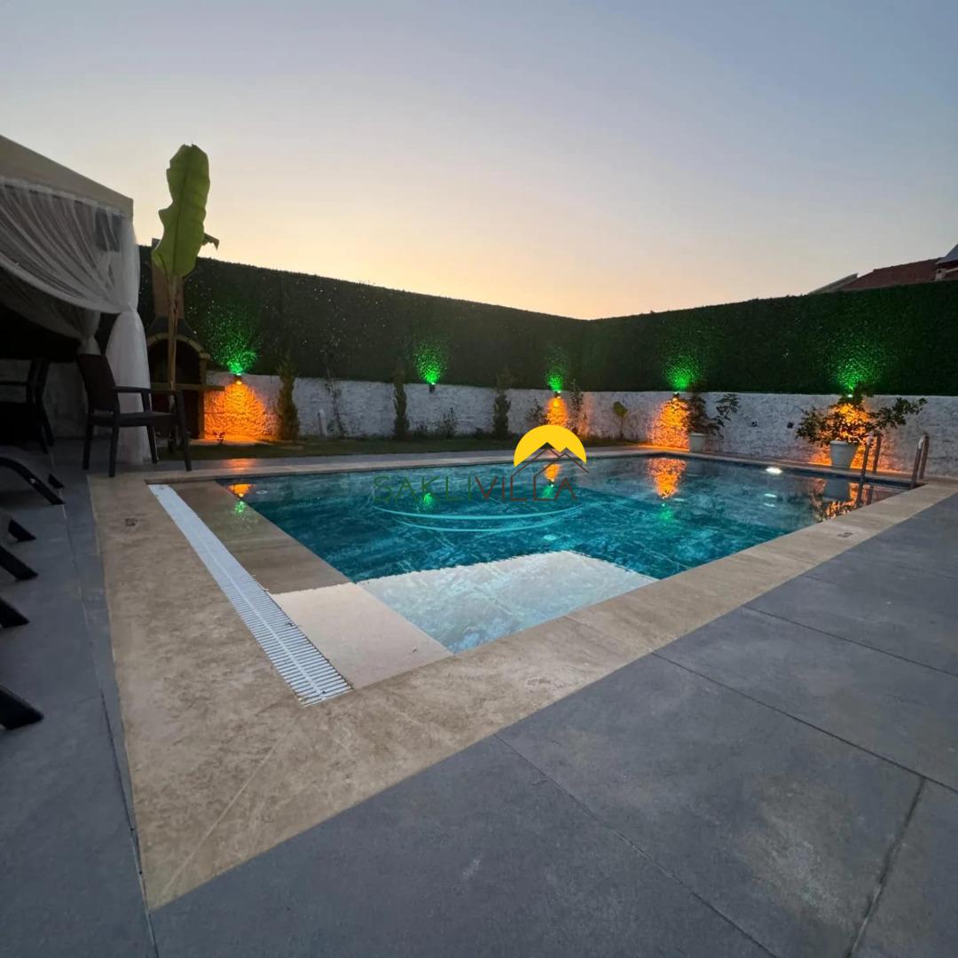 Bahçe düzenlemesi, villanın ferah ve dinlendirici atmosferini tamamlar. Havuz terası ve bahçe, açık havada yemek ve sosyalleşme imkânı sağlayacak bir donanıma sahiptir: barbekü alanı, dışarıda yemek için uygun masa ve sandalyeler ve güneşlenme ekipmanları misafirlerin kullanımına sunulmuştur. Bu unsurlar, özellikle akşamüstü ve akşam saatlerinde doğayla iç içe, rahatlatıcı bir yemek ve sohbet ortamı oluşturur. Peyzajda seçilen bitkiler ve düzenlemeler, mahremiyeti artırmak ve mekanın görsel çekiciliğini yükseltmek üzere düşünülmüştür.