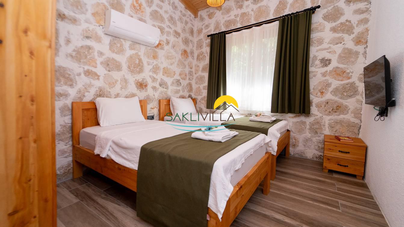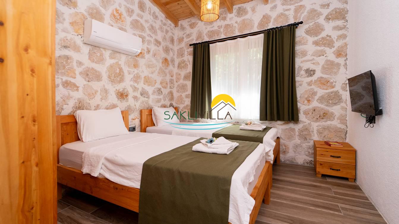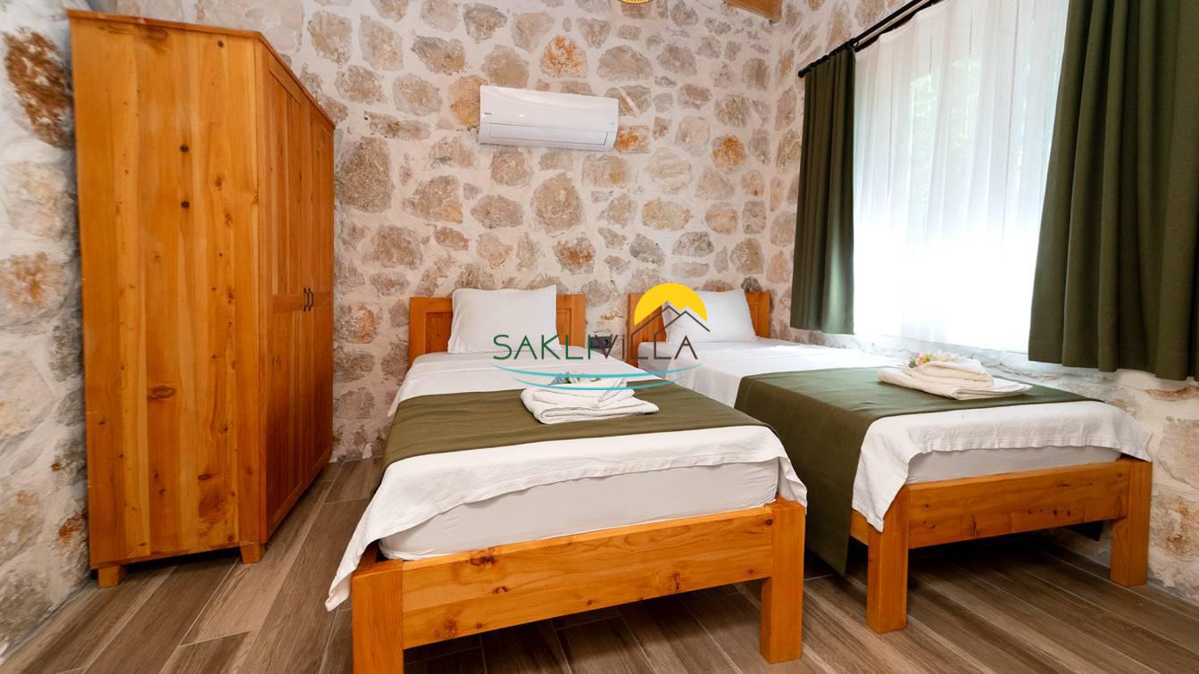 2.Yatak Odası: İki tane tek kişilik yatak, komodin, klima, elbise dolabı, banyo ve lavabo bulunmaktadır.