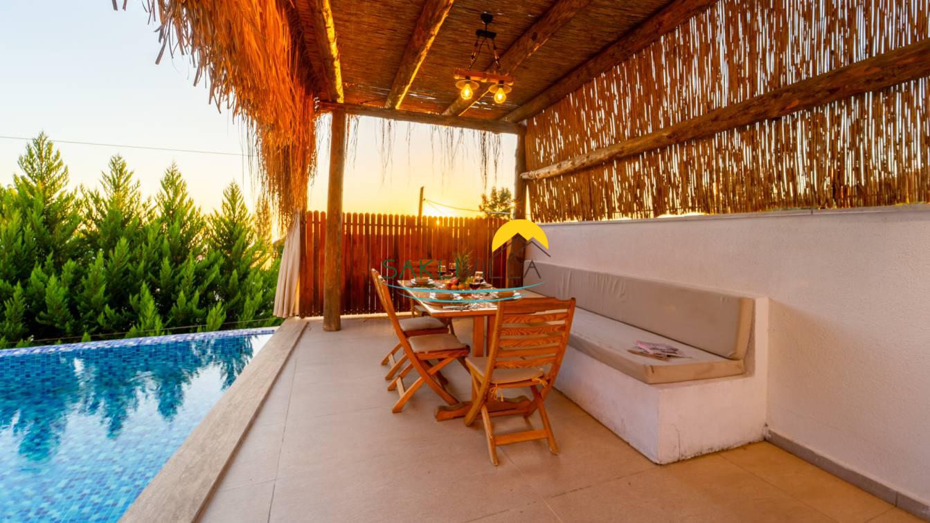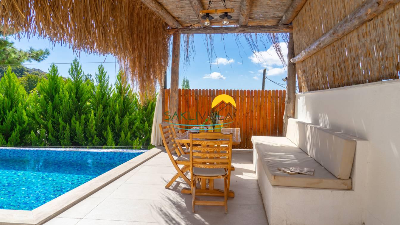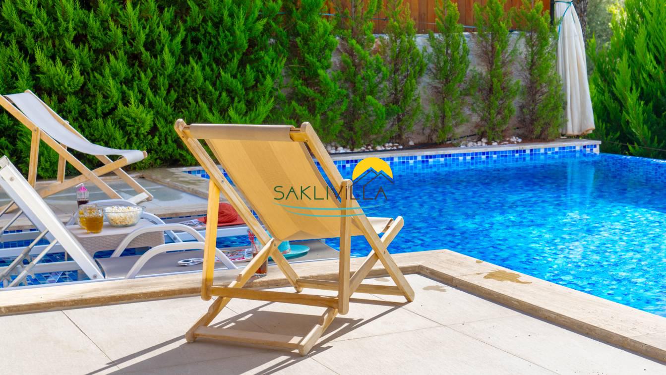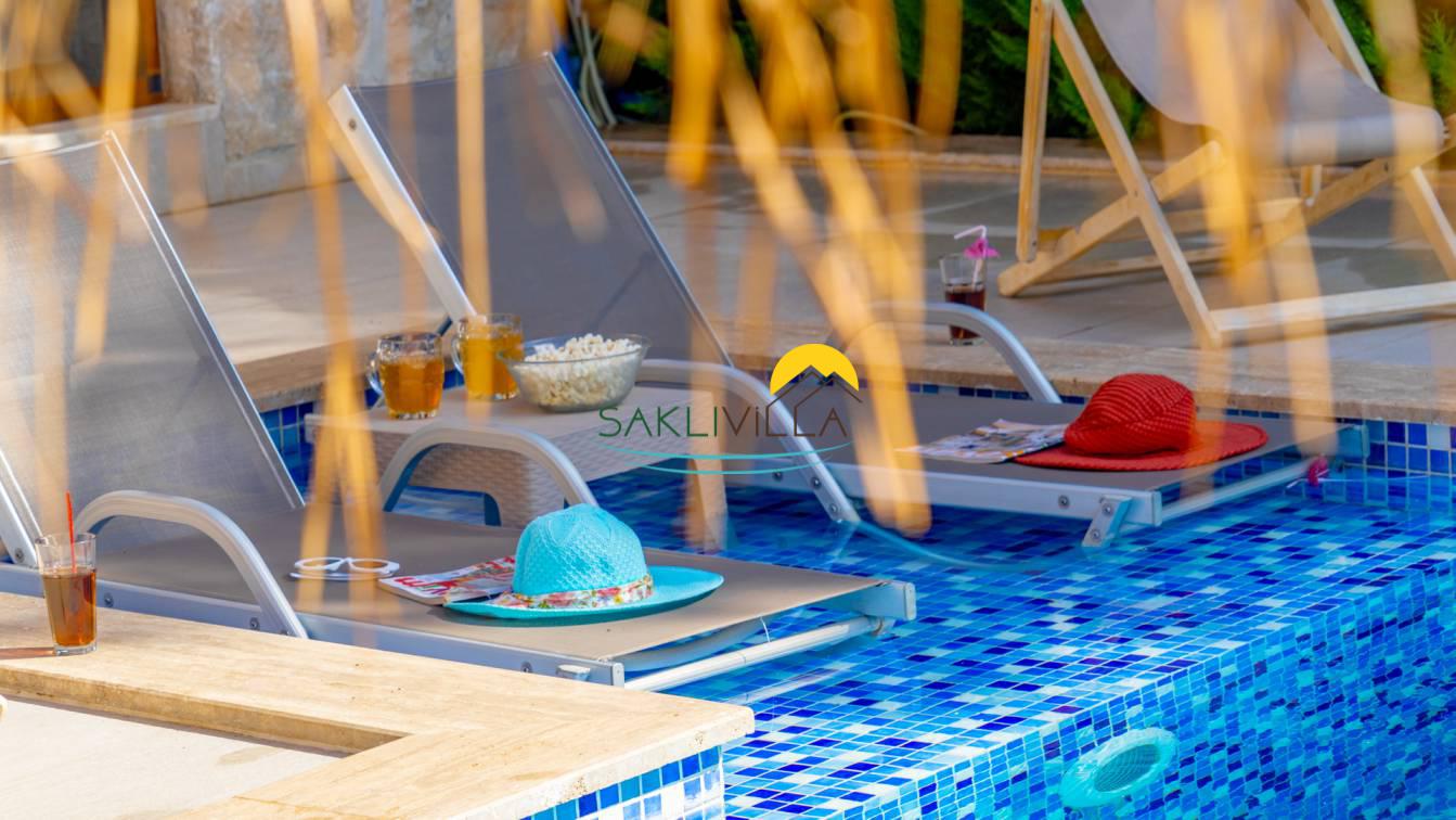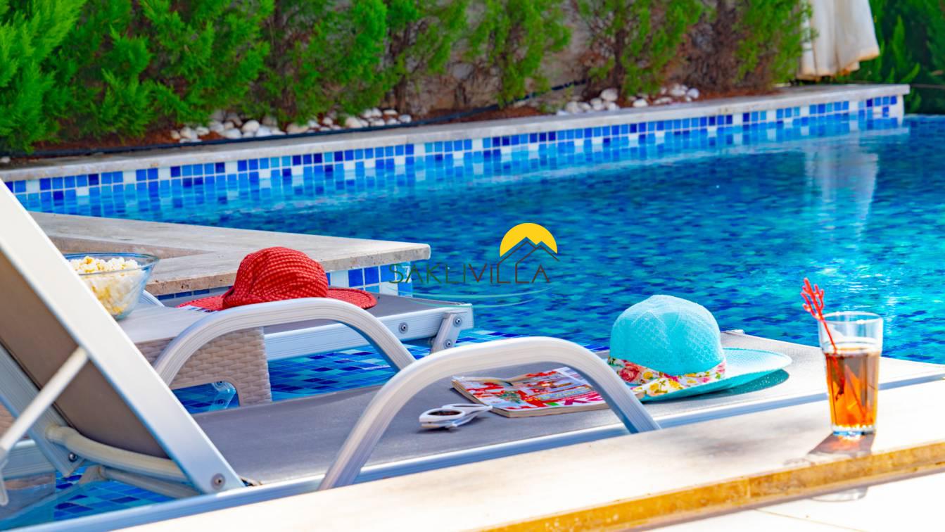 Kiralık Villa Yağmur’un en belirgin özelliklerinden biri, havuz terasının korunaklı olmasıdır. Tatilcilerin dinlenme ve serinleme ihtiyacını karşılamak üzere planlanmış bu özel alan, dış dünyadan izole edilmiş yapısıyla mahremiyet sunar. Havuzun temiz ve düzenli yapısı, misafirlerin suyun keyfini güven ve rahatlık içinde çıkarmalarını sağlar. Böylece, villa sakinleri doğanın içinde ancak şehir gürültüsünden uzak bir ortamda tatillerini geçirebilirler.