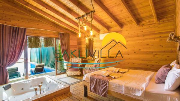 Yatak Odası: 1 adet çift kişilik yatak, klima, komodin, makyaj masası, jakuzi, banyo ve tuvalet bulunmaktadır.