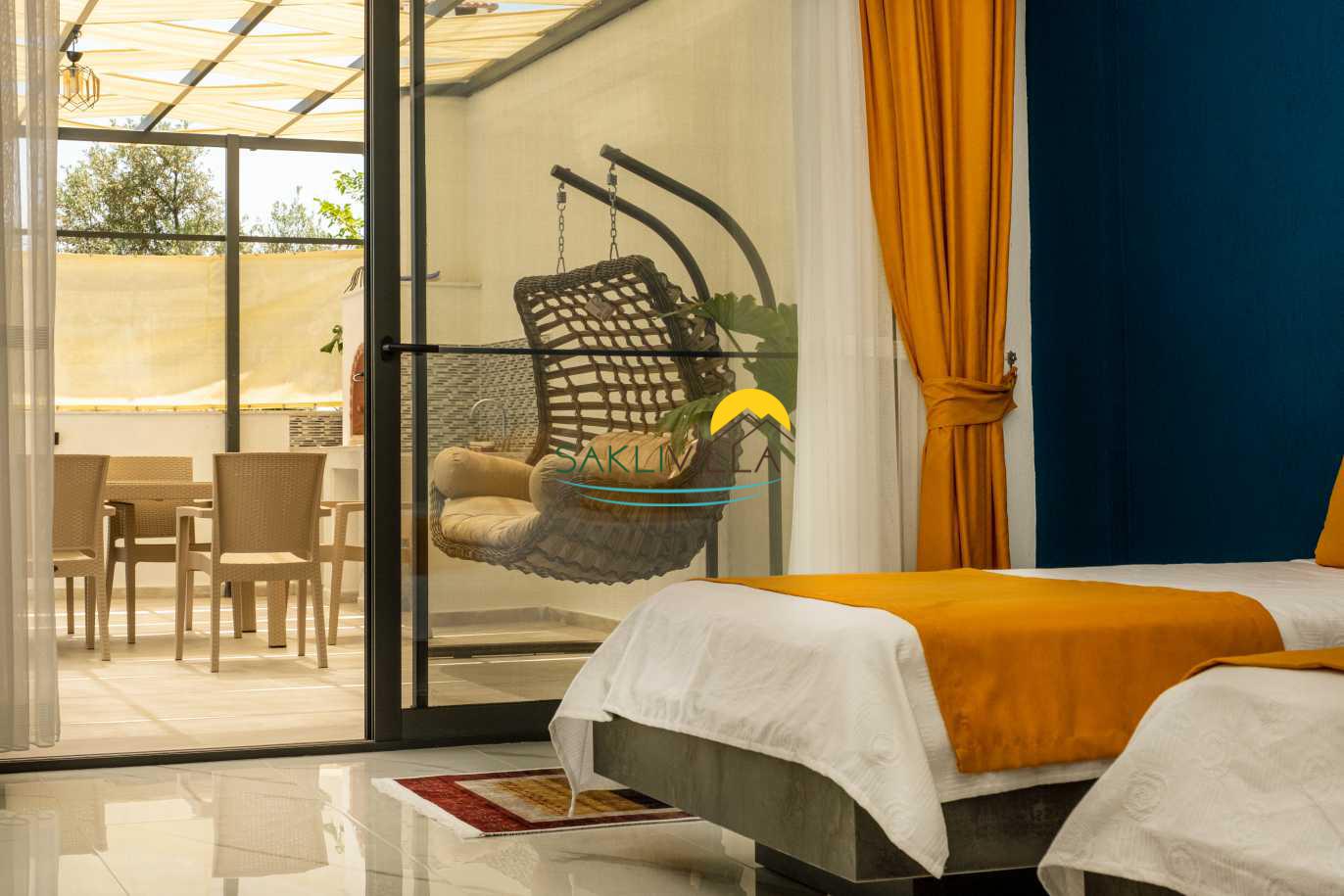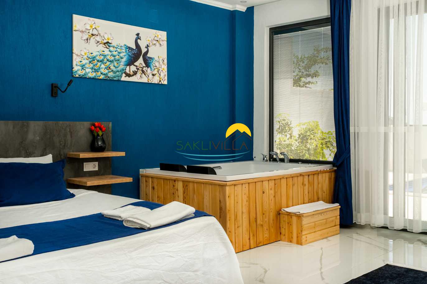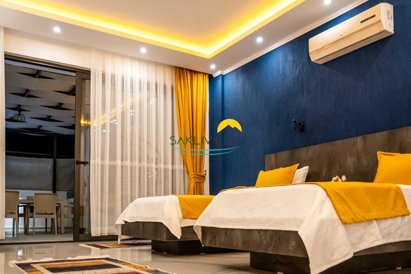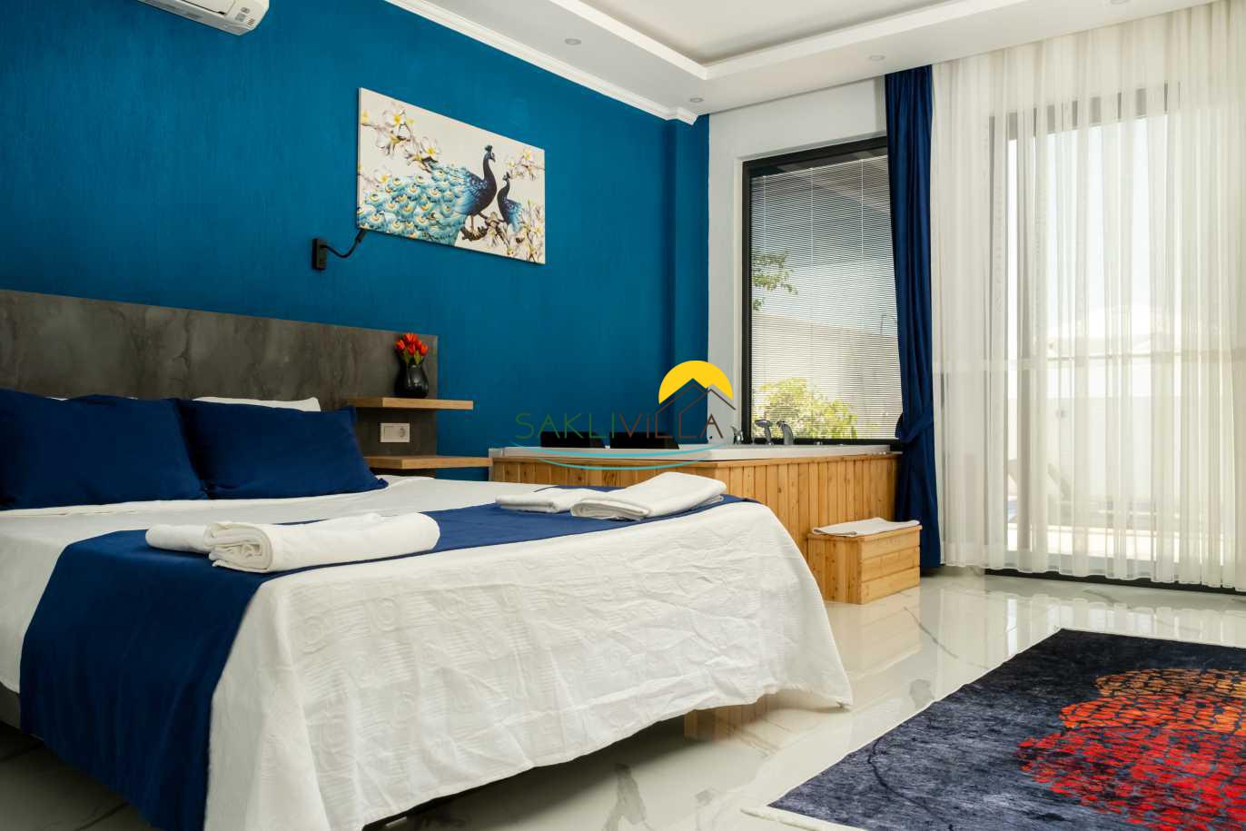 Villa Yudum’un iç tasarımı, hem estetik hem de fonksiyonel bir şekilde düşünülmüştür. Renkli ve şık dekorasyon öğeleri, misafirlerin gözünü okşarken, konforlu yaşam alanları sayesinde herkes kendini evinde gibi hissedecektir. Villamızda toplamda iki yatak odası bulunmaktadır. Birinci odada çift kişilik yatak, klima, jakuzive özel banyo alanı yer alırken; ikinci odada ise iki adet tek kişilik yatak, klima ve modern bir banyo bulunmaktadır. Bu düzenleme, hem aileler hem de arkadaş grupları için yeterli alan ve konfor sağlamakta, herkesin ihtiyaçlarına cevap verebilecek şekilde tasarlanmıştır.