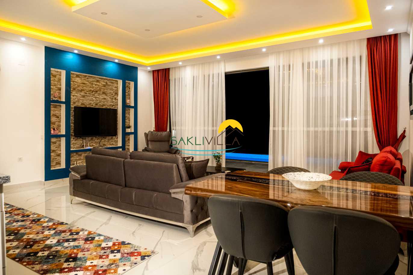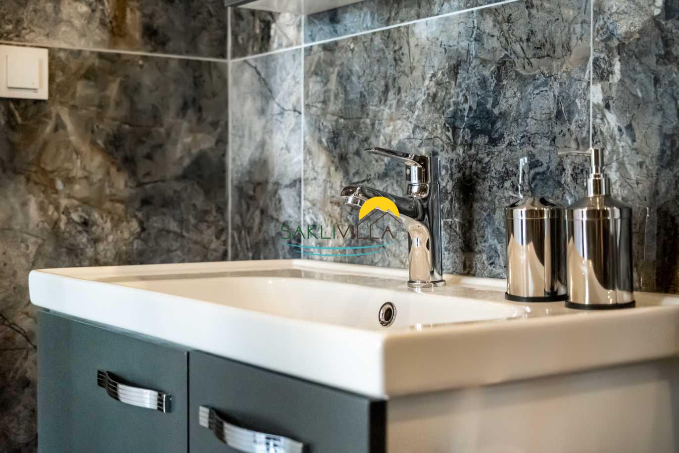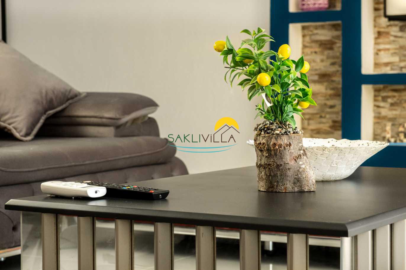 Salon bölümünde ise geniş bir oturma grubu, televizyon, klima ve tam donanımlı mutfak bulunmaktadır. Bu alan, misafirlerin bir araya gelerek keyifli sohbetler edebileceği ve birlikte güzel yemekler hazırlayabileceği bir atmosfer sunmaktadır. Geniş pencereler sayesinde bol miktarda doğal ışık alan bu alan, ferah bir ortam yaratmakta ve dışarı dan gelen doğal güzelliklerle bütünleşmektedir.