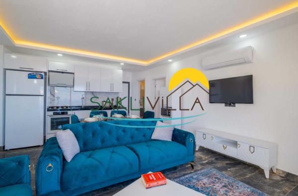 Salon: Villamızın deniz manzaralı salonu içerisinde; koltuk takımı, orta sehpa, TV, TV ünitesi, klima, uydu alıcısı yer almaktadır.