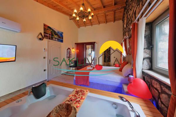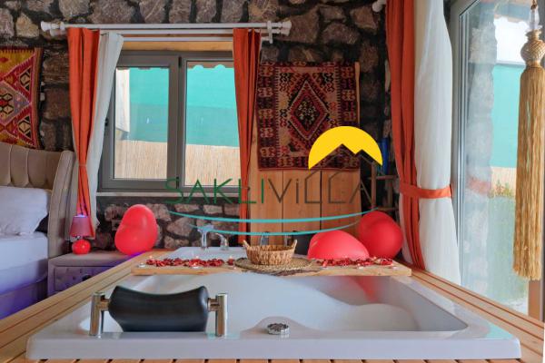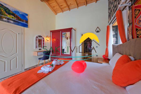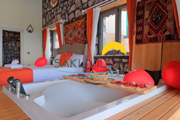 1. Yatak Odası: 1 adet çift kişilik yatak, elbise dolabı, makyaj masası, komodin, klima, jakuzi, banyo ve tuvalet bulunmaktadır.